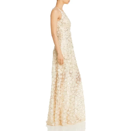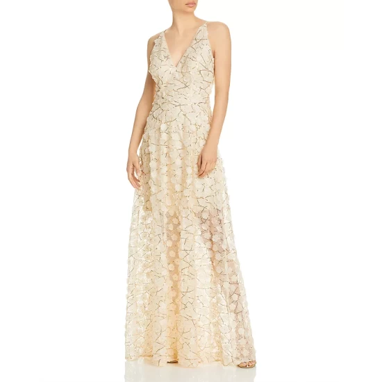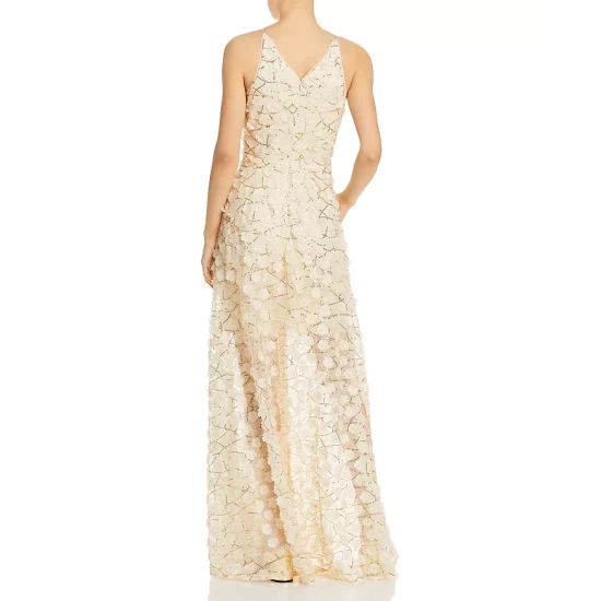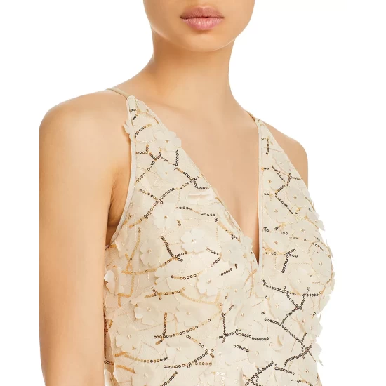 - Mesh overlay with allover sequins and floral appliqués